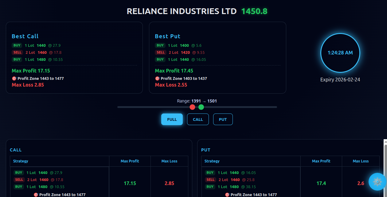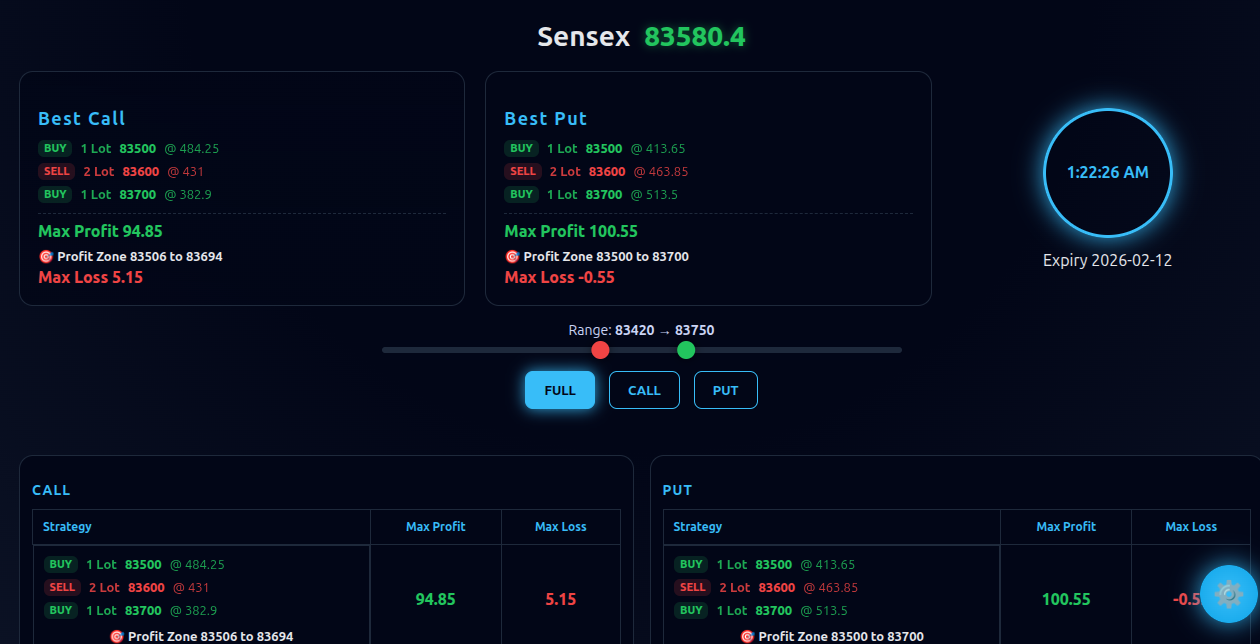 Auto Butterfly Engine with Best Call / Best Put AI Selection, live range filtering and a quant-style dashboard.